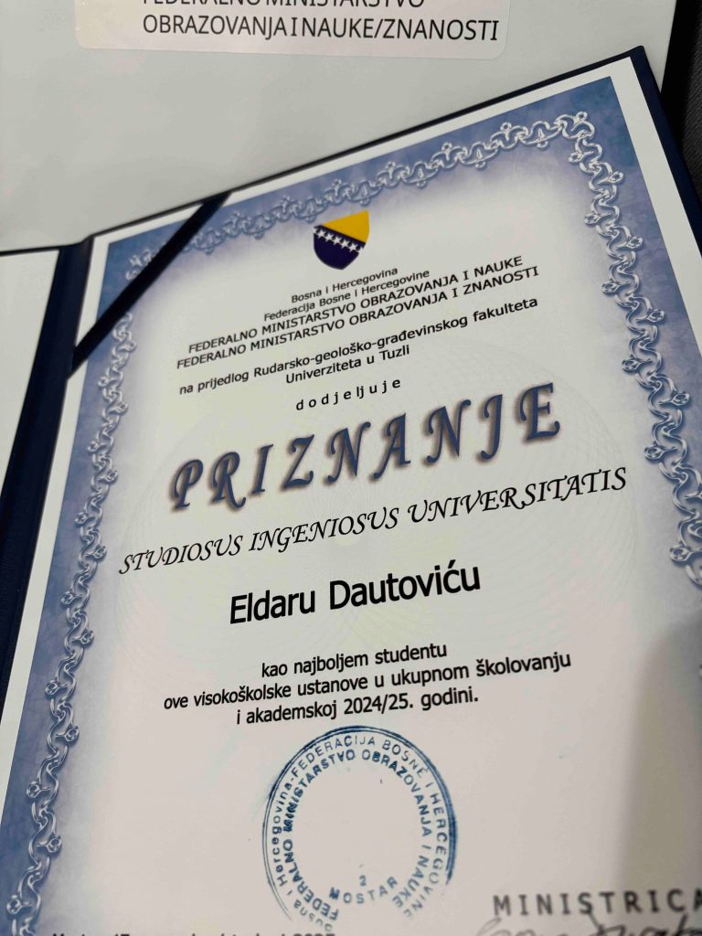 Jedan od dobitnika ove prestižne studentske nagrade je i naš student, sada već bachelor- inženjer građevinarstva, Eldar Dautović.