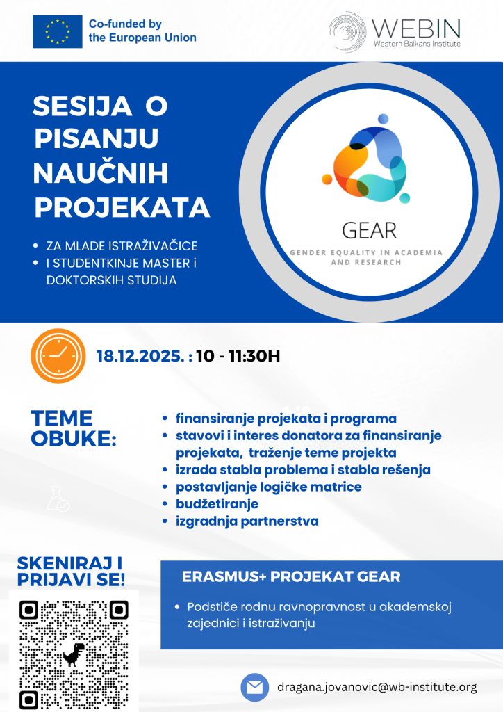 u okviru projekta GEAR biće organizovana online sesija o pisanju projekata za mlade istraživačice te studentice master i doktorskih studija. Sesija će se održati 18. decembra u 10:00 sati.